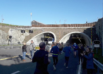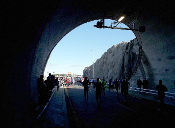 Bei km 6 schnappen wir kurz Luft, eine Tunnelröhre ist zu Ende und die nächste beginnt. Viele Zuschauer nutzen diese einzige Gelegenheit an der Strecke, den Läufern zuzujubeln. 100 Meter weiter kommt die nächste, die 15 Kilometer lange Röhre.