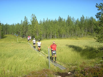 Die Ultraläufer bewegen sich im Moment eigentlich auf der Variante für Radler. Und genau wie die Mountain-Biker bei ihrem Rennen eine Woche zuvor biegen sie schon nach wenigen hundert Metern nach links, haben bald darauf die letzen Häuser hinter sich gelassen und sind in die schier endlosen skandinavischen Wälder eingetaucht, in denen sie für den weitaus größten Teil des Laufes auch bleiben werden.